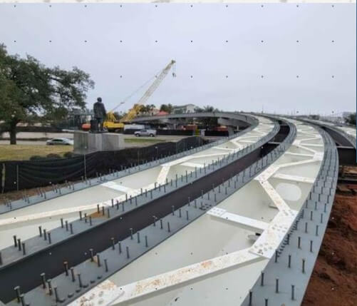 Project Description: Construction of a new tram, bike, and pedestrian bridge crossing US Highway 90. The project includes dedicated pathways for each –tram, bike, & pedestrian involving sitework, pile driving, excavation of old utilities and placement of new utilities, concrete placement for bridge deck, asphalt paving, and landscaping.